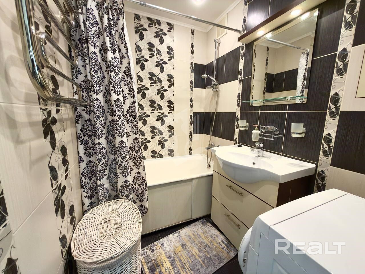 Квартира светлая, солнечная сторона, стильный светлый ремонт. Обустроено много места для хранения. Комплект техники: плита, микроволновая печь, духовка — всё готово к заселению.