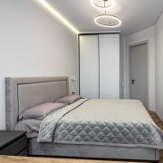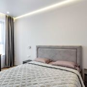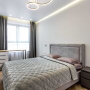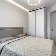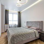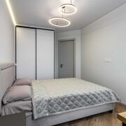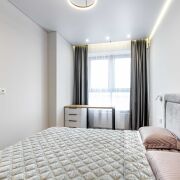 - Уютная спальня с комфортной кроватью, ортопедическим матрасом, местами хранения и рабочим местом.