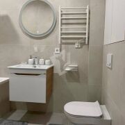 -В ванной комнате присутствует ванна, зеркало с подсветкой, подвесной унитаз, электрический полотенцесушитель, подвесной умывальник с местом хранения.