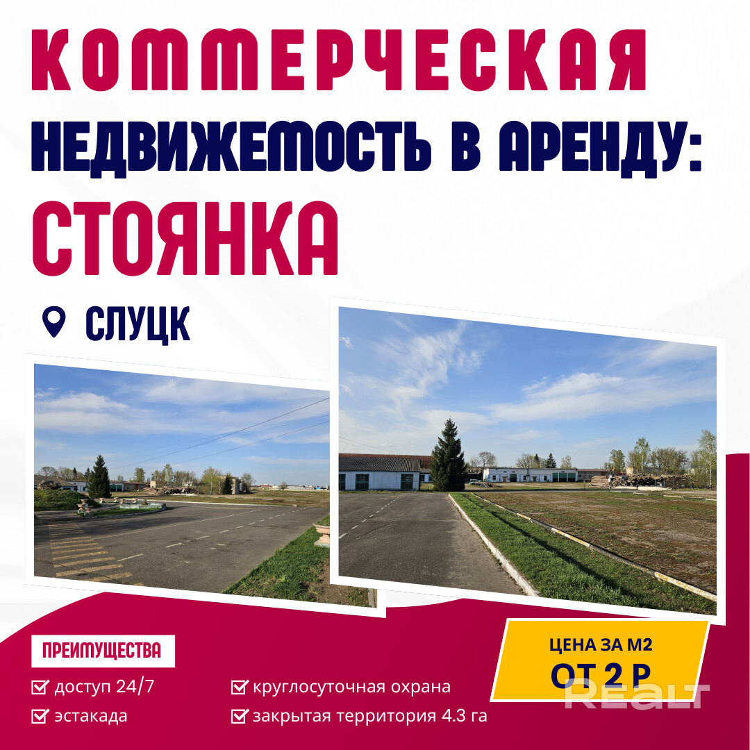 Аренда стоянки и открытой площадки на ул. Тутаринова, 12к7 - Слуцк. Арендные каникулы. Большая закрытая территория 4,3 га, есть машиноместа на территории, остановка транспорта в пределах 1 минут ходьбы, доступ на территорию и в здания 24-7, без выходных на территорию сможет заехать фура или большегруз, дорога широкая и нет непонятных перекрестков, склонов и пересечений с жилой зоной, возможна стоянка фур.