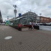 Прекрасное расположение. В самом центре города рядом со станциями метро "Октябрьская" и "Немига". Имеется парковка во дворе.