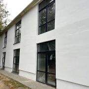 - современные фасадные решения — светлый фасад, высокие окна (3-4 м.)
