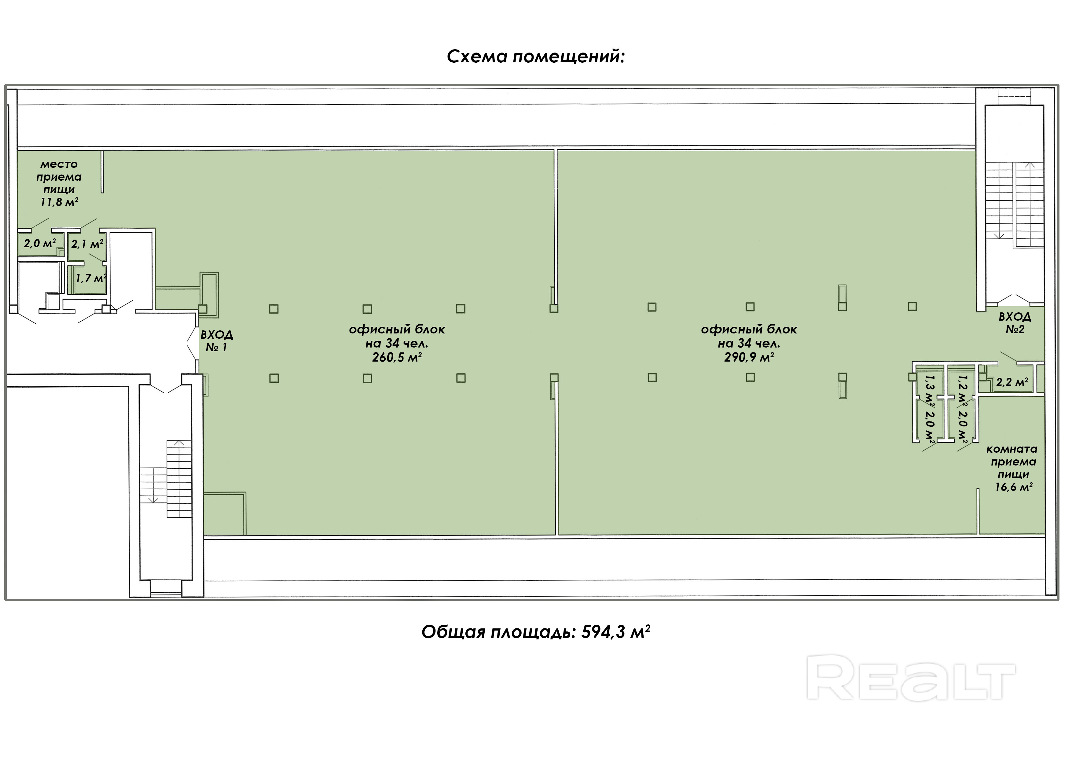 Общая площадь, предлагаемых в аренду помещений: 594,3 кв.м.;
