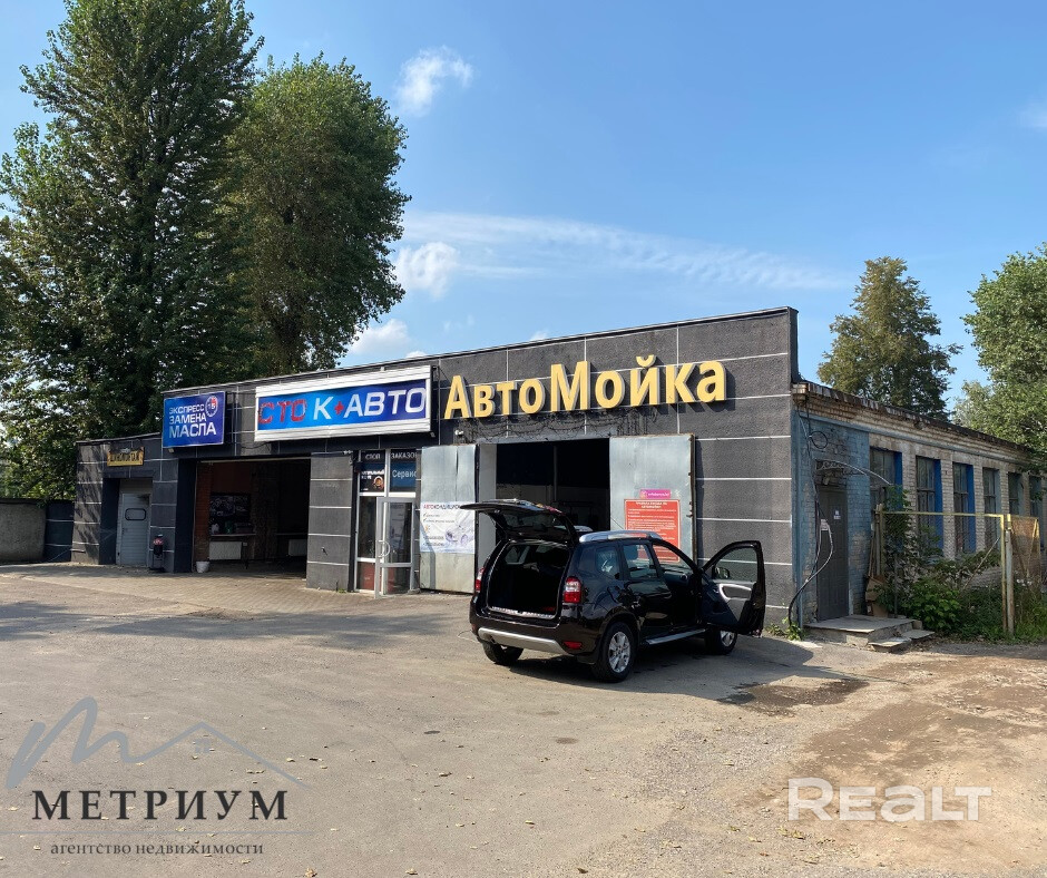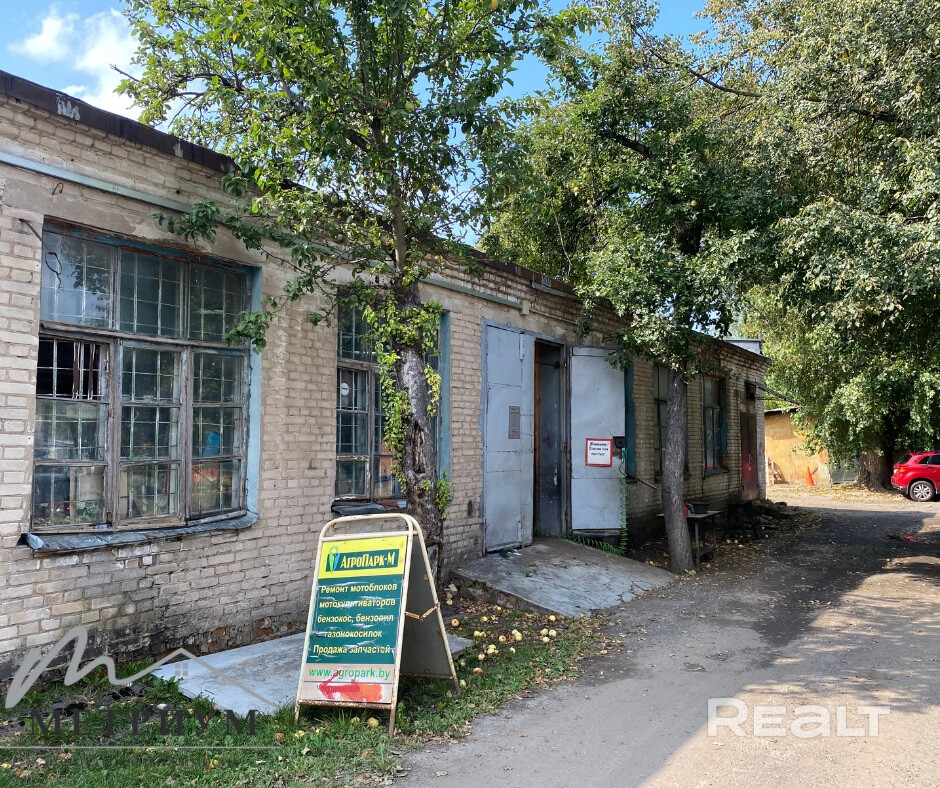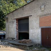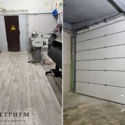 Ворота для въезда автомобиля внутрь. В помещении выполнена черновая отделка. Проведены все необходимые коммуникации, есть доступ к санузлу. Рядом со входом парковка для автомобилей.