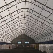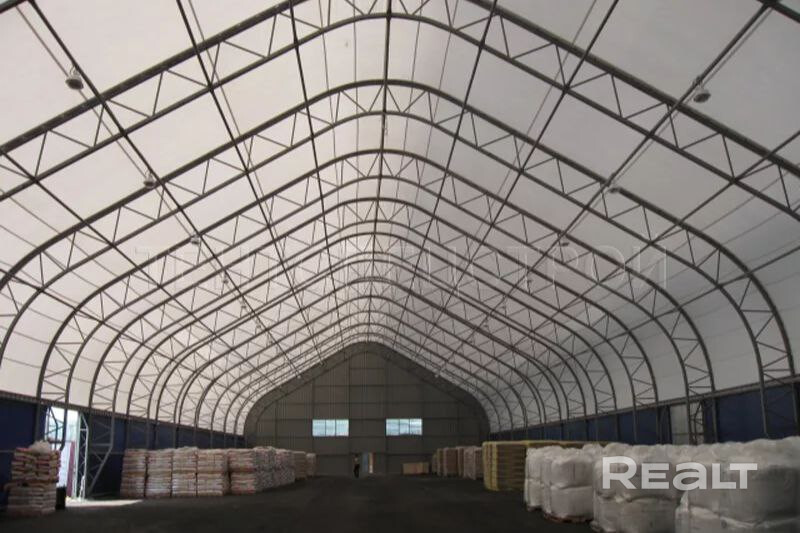 - Аналогичный тентовый склад 915 м2 (высота в коньке 7–8 м, ворота 5×5 м с двух сторон)