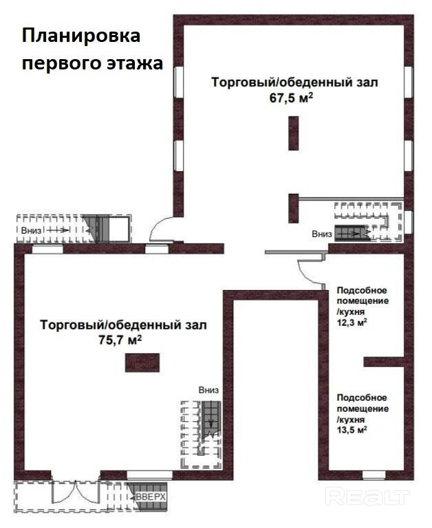 Помещение занимает первый и цокольный этажи жилого дома и имеет 3 собственных входа, на цоколе расположены санузлы,подсобные/складские помещения, 1-й этаж используется как обеденный/торговый зал и кухня/складское помещение.
