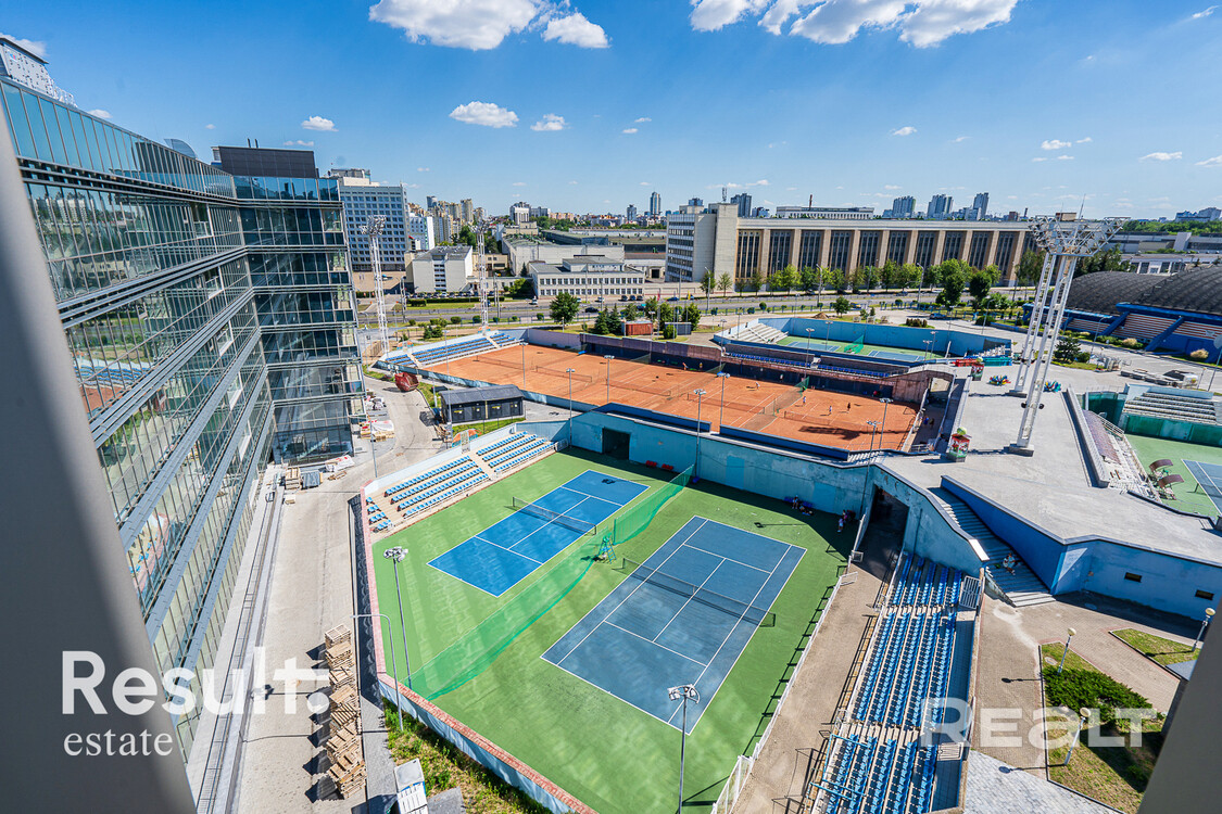 Панорамные окна в пол с видом на проспект и теннисные корты.