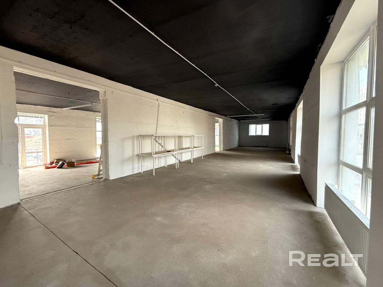 Помещение 282,1 кв.м. на 2 этаже. ул. Старовиленская, 100. Что рядом: Комаровский рынок, пл. Я. Коласа, ул. Хоружей, ул. Богдановича. Отделка внутренняя — белые стены под кирпич, бетонный пол, современные фасадные решения — светлый фасад, высокие окна (3-4 м.), новые стеклопакеты с черными рамами, лофт-стиль, очень светлые и просторные помещения (открытая планировка, окна с двух сторон практически в пол)