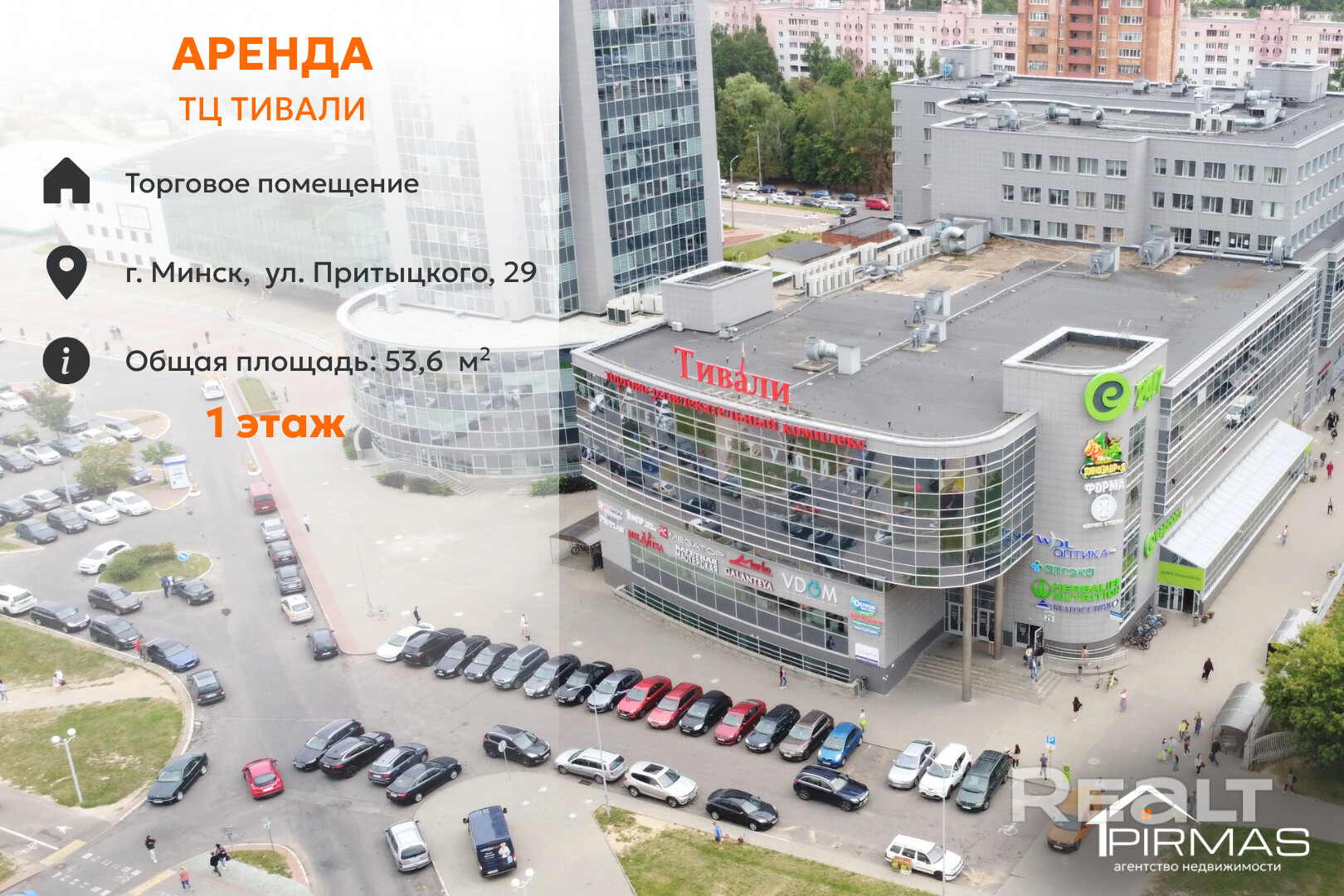 Сдаётся в аренду торговое помещение площадью 53,6 м2 на 1-м этаже торгово-развлекательного комплекса «Тивали» (г. Минск, ул. Притыцкого, 29).