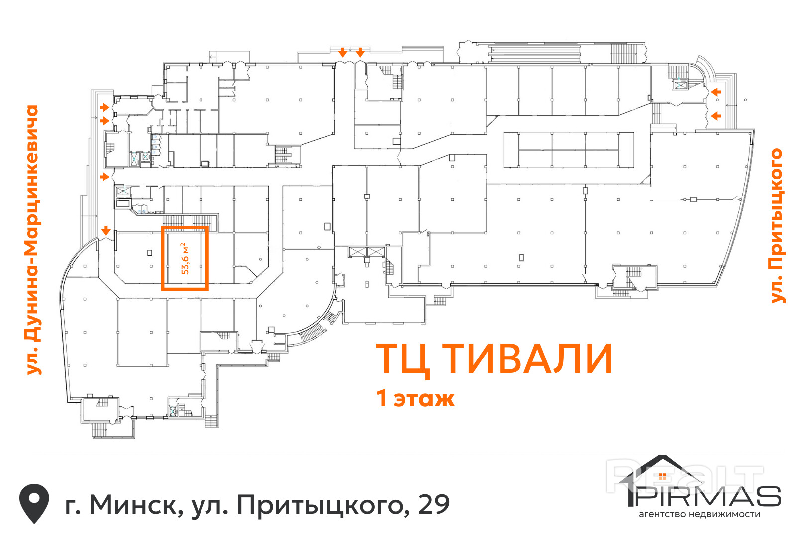 Сдаётся в аренду торговое помещение площадью 53,6 м2 на 1-м этаже торгово-развлекательного комплекса «Тивали» (г. Минск, ул. Притыцкого, 29).