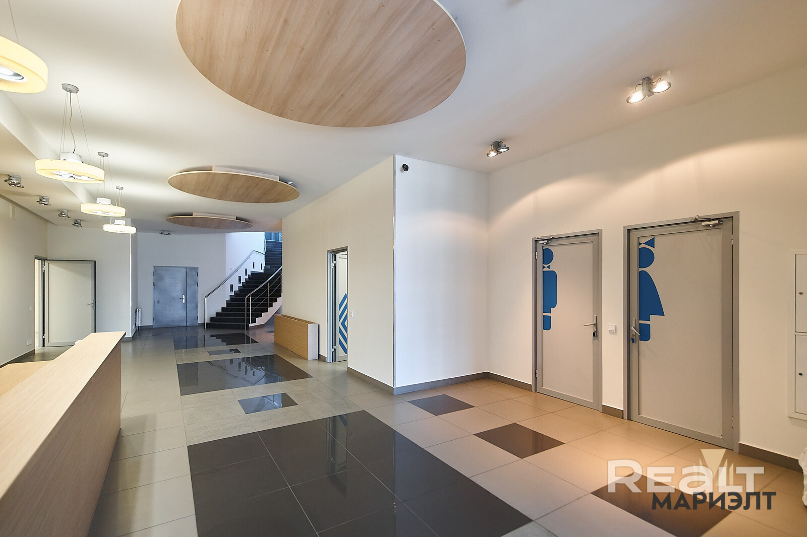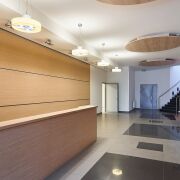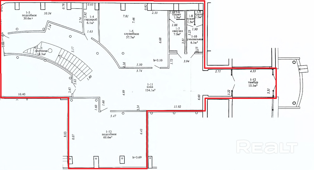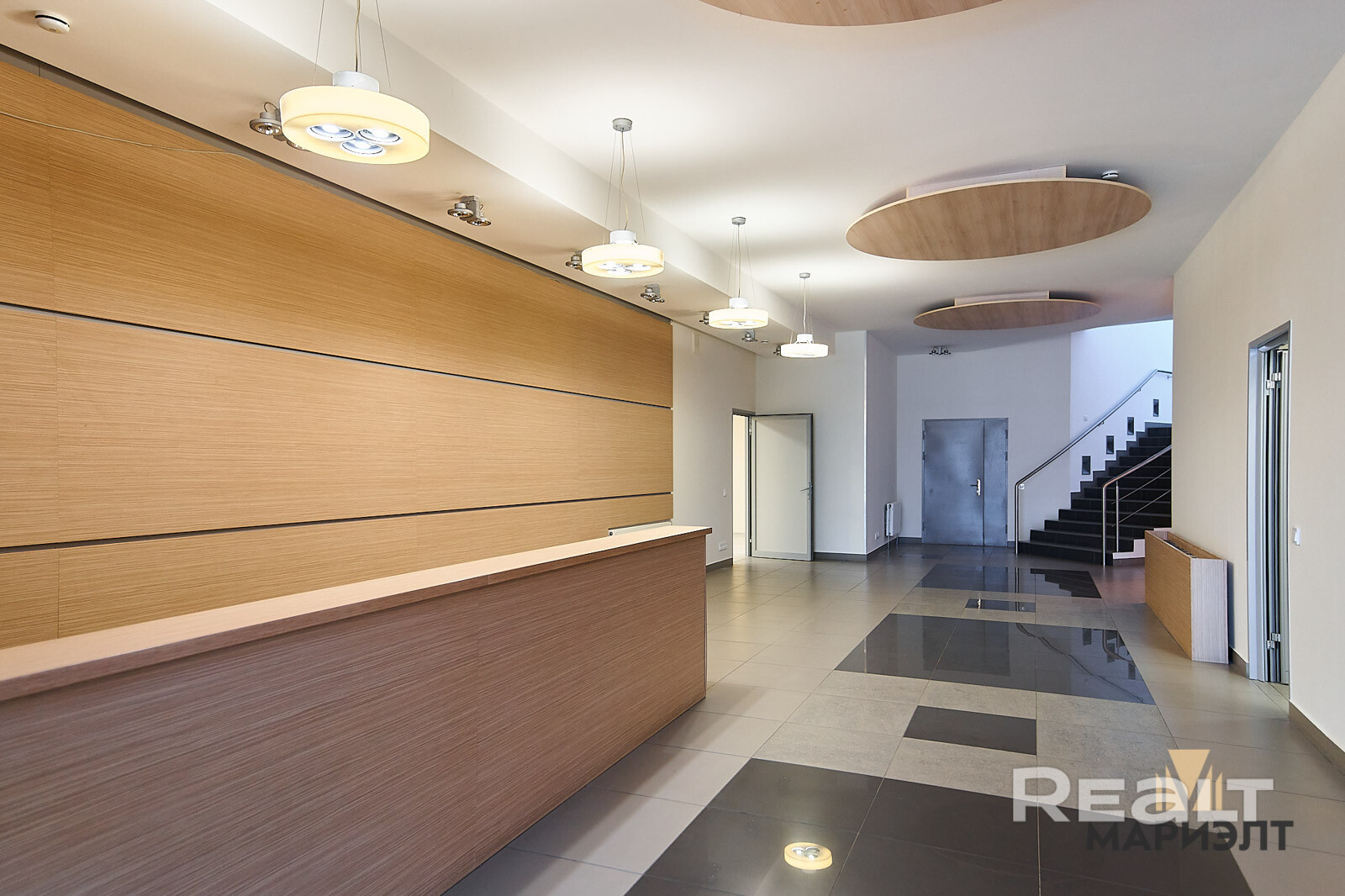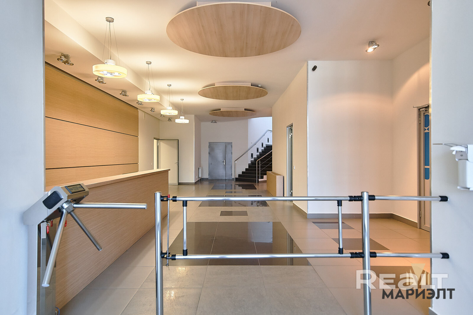 1-й этаж – 340,5 м2: зона ресепшена, кухня, сан. узел, гардероб, переговорная (кабинет).