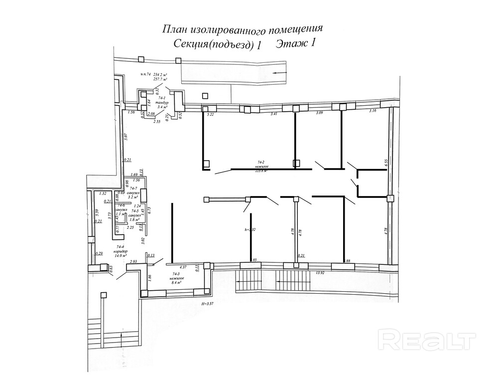 Находится на 1 этаже, имеет 2 входа: со двора жилого дома и со стороны ул. К. Заслонова. Фактическая планировка кабинетной системы. Имеется помещение для размещения кухни с коммуникациями, кабинеты (некоторые с дополнительной мокрой точкой), подсобные помещения, собственный санузел.