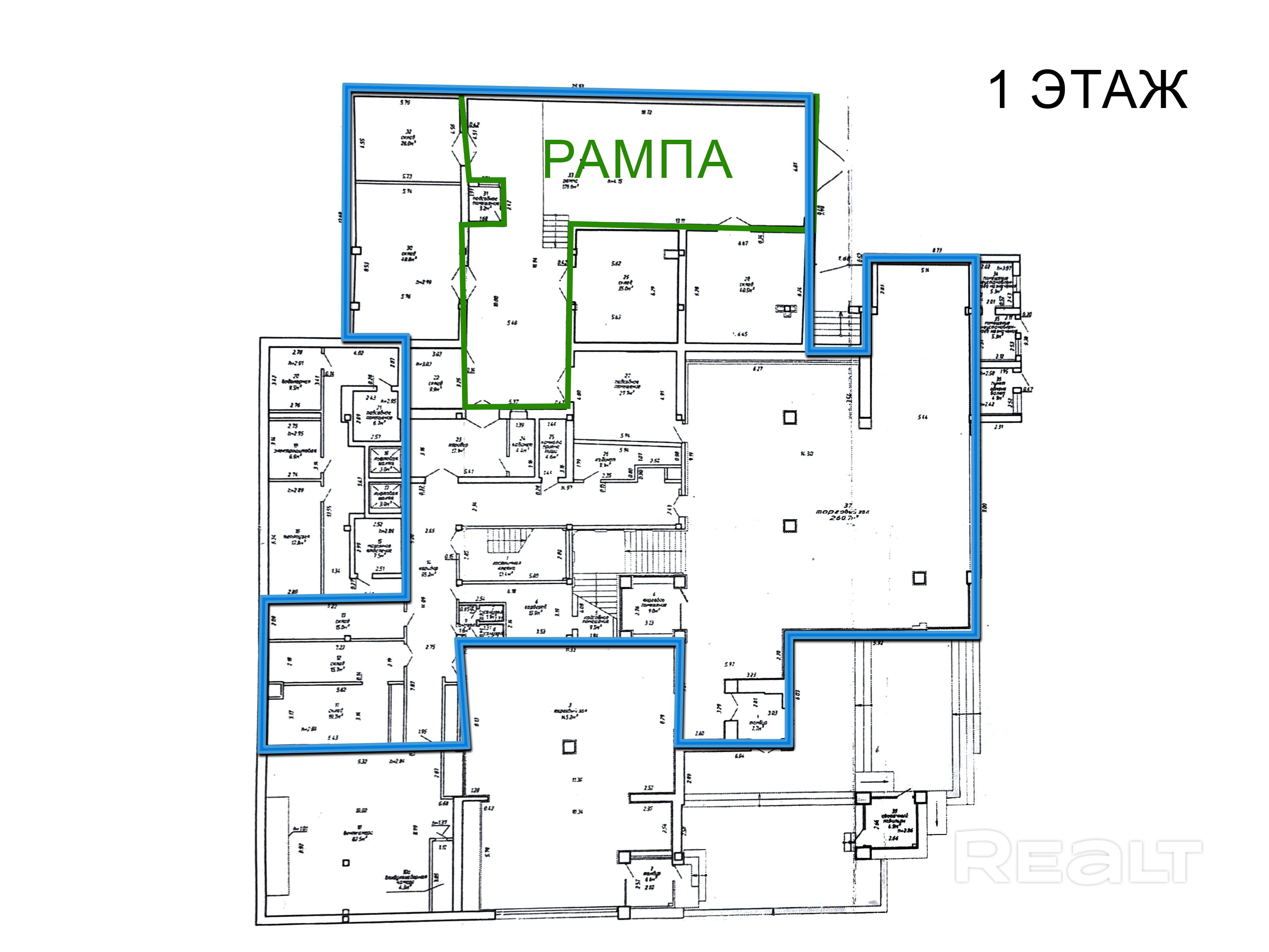 1-й этаж – 640 м2 (торговое - 230 м2, рампа - 176 м2, склады - 160 м2, вспомогательные – 52.6 м2);