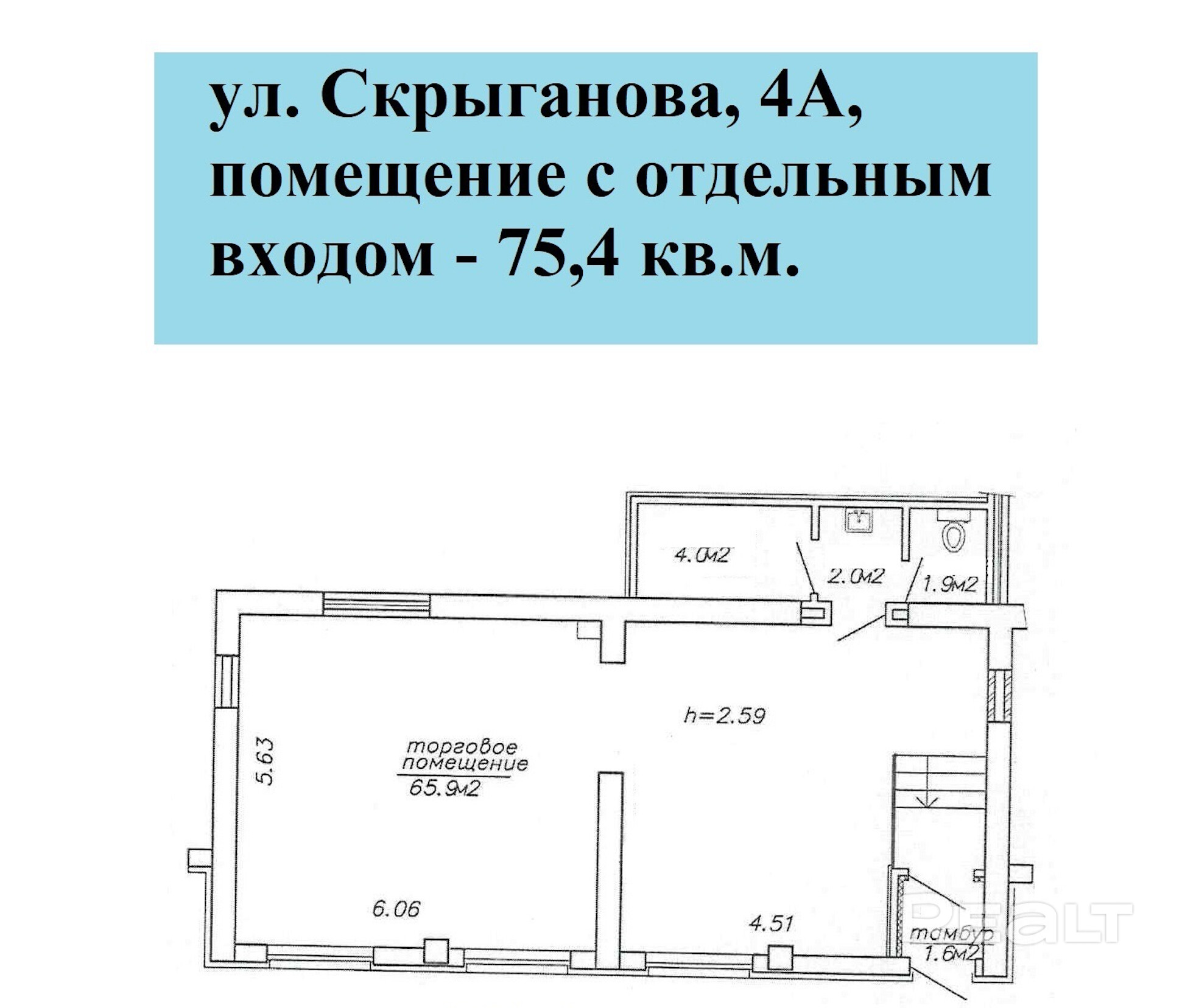 Помещение под сферу услуг/офис с отдельным входом (75 м2). Ул. Скрыганова 4А.