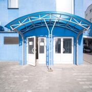 Парковка со шлагбаумом (доступ по пультам), два отдельных входа, один из которых выходит во двор и подходит для разгрузки.