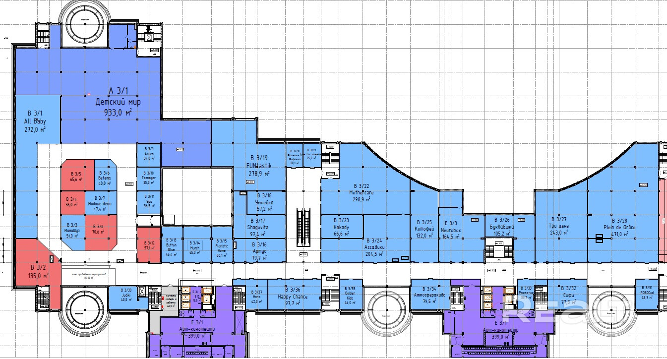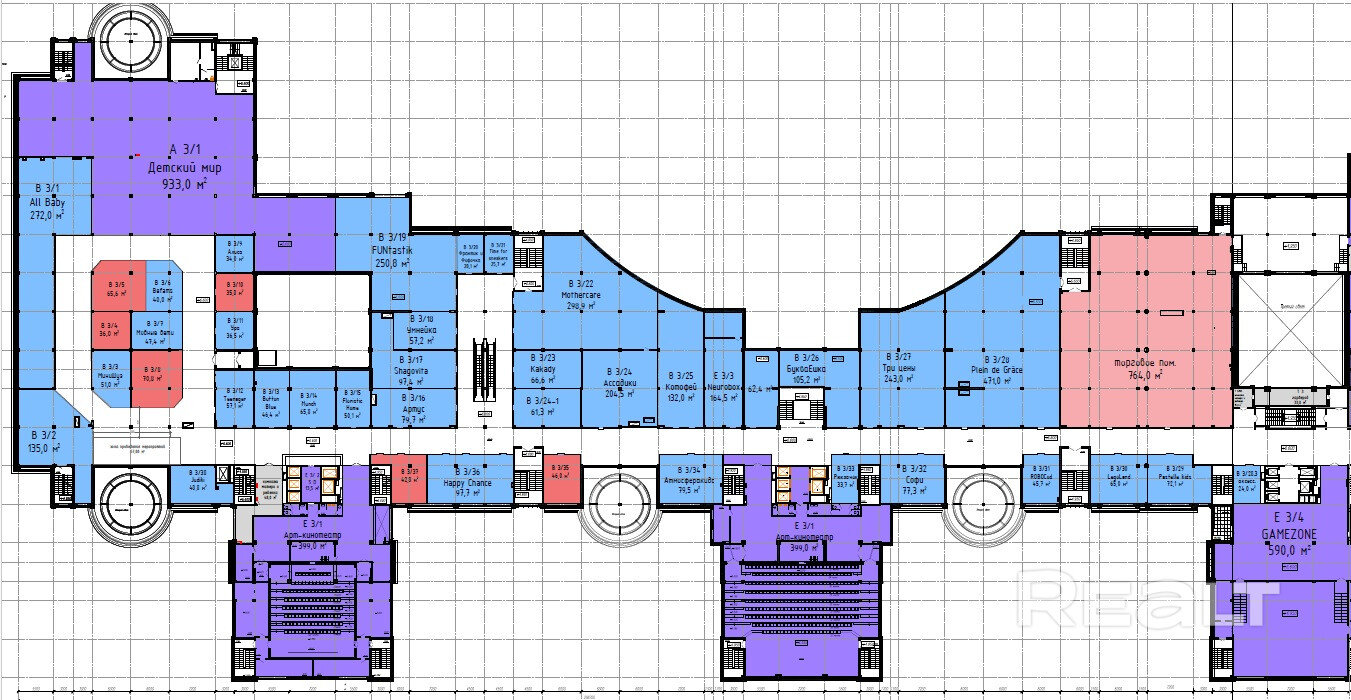 На первом этаже открыты супермаркеты "Евроопт", "5 элемент", а также магазины косметики, парфюмерии и ювелирных изделий, на втором – контактный ZOOпарк, бутики одежды и обуви, а на третьем – фудкорт, магазины детских товаров и игрушек, 3D кинотеатр, и развлекательный центр с детским лабиринтом, боулингом, площадкой для лазертага и игровыми автоматами, а также увлекательными квестами. Подняться на верхние ярусы можно с помощью эскалаторов и лифтов.