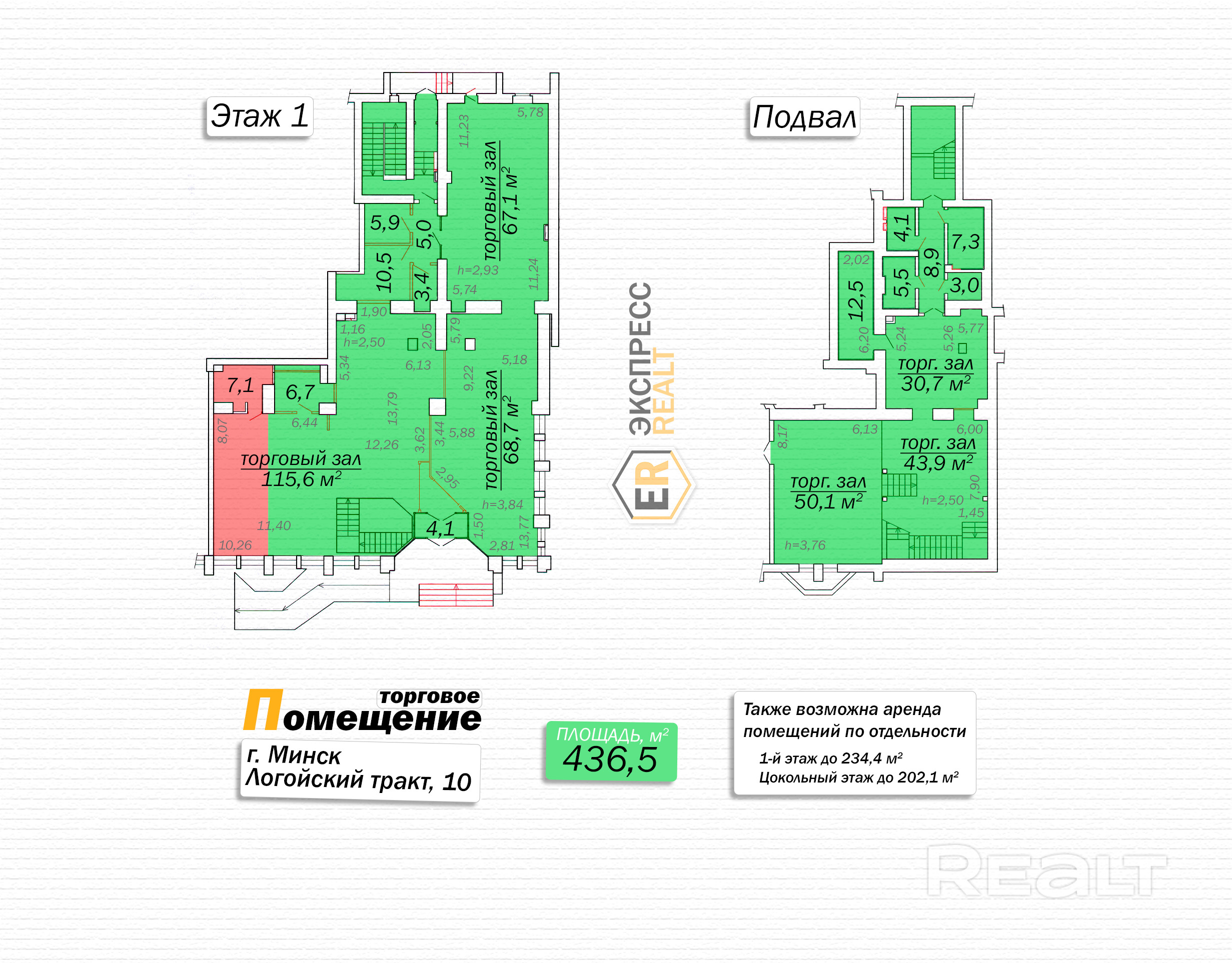 - Аренда помещений на первом этаже отдельно (до 234,4 м2), на цокольном этаже отдельно (до 202,1 м2) или всего комплекса целиком (436,5 м2).