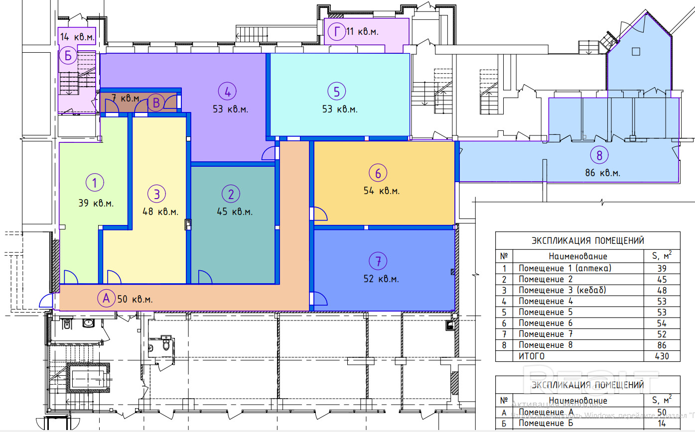 Первый этаж будет разделен не небольшие павильоны: 1) 39 м2; 2) 45 м2; 3) 48 м2; 4) 53 м2; 5) 53 м2; 6) 54 м2; 7) 52 м2; 8) 86 м2.