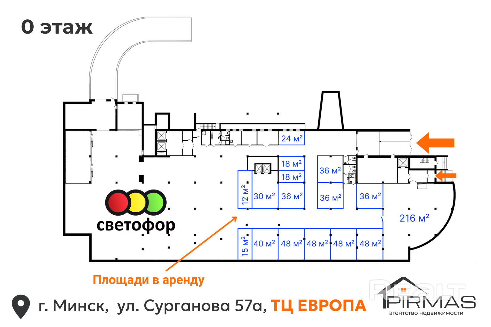 Этаж: Нулевой (высокая проходимость, соседство с супермаркетом «Светофор»).