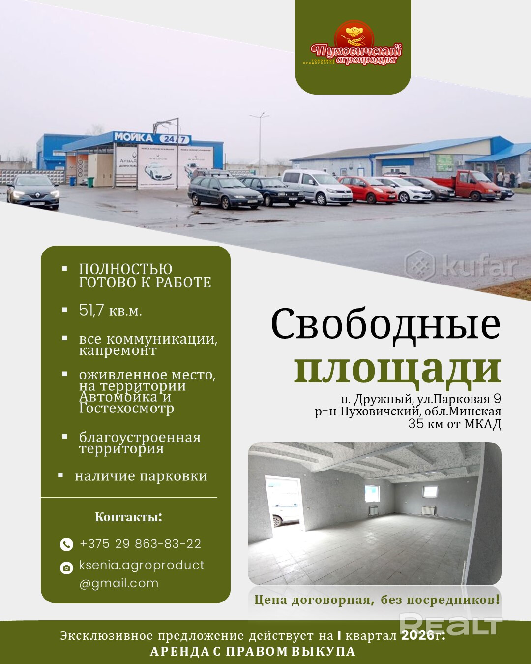!!!Помещение полностью готово к работе!!! - площадь 51,7 кв.м - все коммуникации - просторная парковка - оживленное место: в шаговой доступности Автомойка, Пункт техосмотра, ЖКХ, Стоматологическая поликлиника, Школа, Магазины. Рядом проходит трасса Р-69 (Смолевичи-Шацк). - территория облагорожена