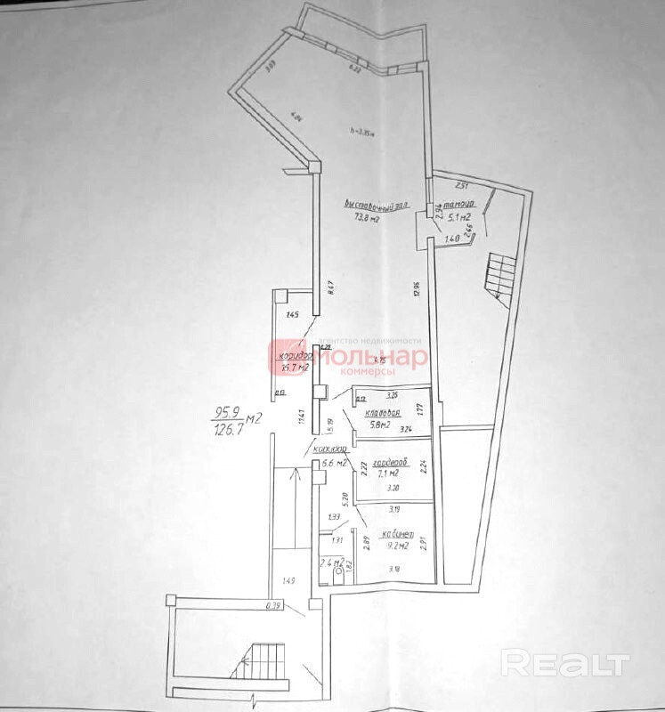 Есть возможность разделить помещение на несколько зон — торговую, офисную и складскую. Сейчас внутри: торговый зал 73,8 м2, кладовая 5,8 м2, гардероб 7,1 м2, отдельный кабинет 9,2 м2, санузел.