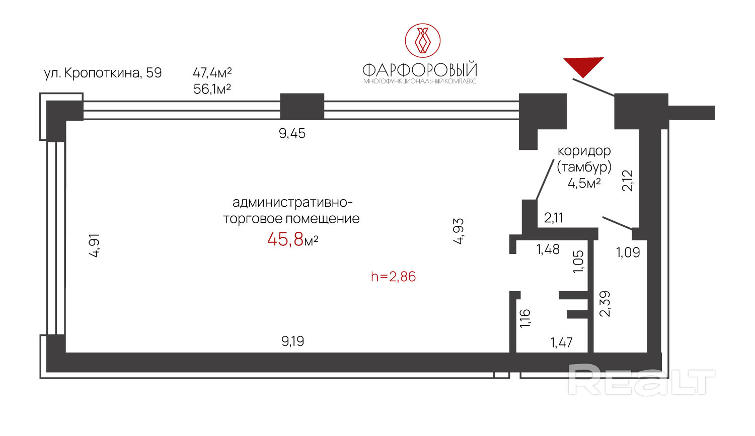 Аренда торгового помещения в жилом доме МК Фарфоровый, 56м2