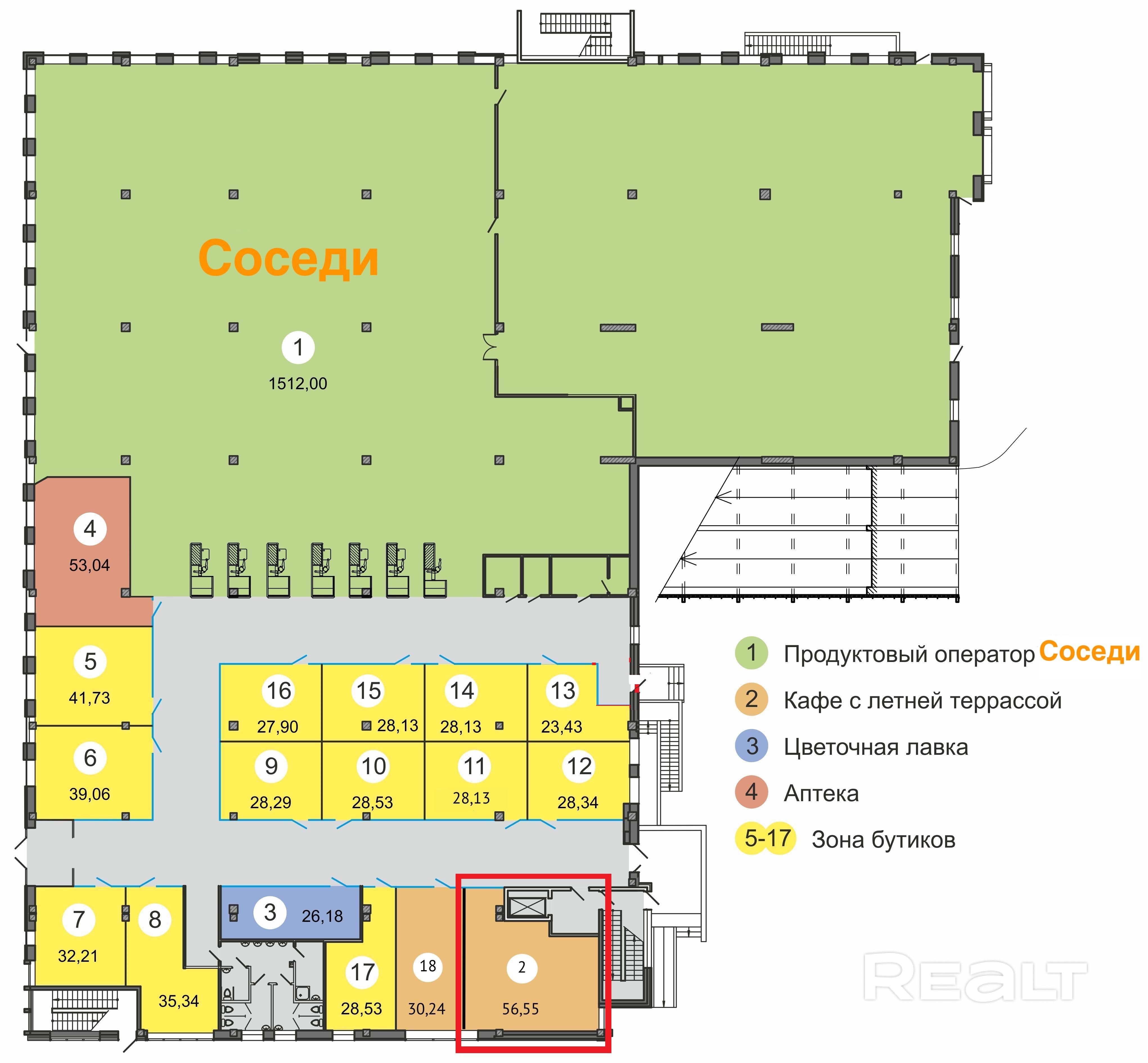 Аренда торгового помещения в ТЦ `4 сезона` по ул. Беды, 46 в г. Минске. Отлично подойдёт для торгового объекта, офиса, пункта выдачи интернет-магазина, салона красоты, бутика, парикмахерской, пр. Есть подключение воды и канализация. Наземные парковки и паркинг в 4 этажа над торговой галереей. В составе объекта: якорный арендатор - `Соседи` - 1500 кв.м. , помещения прикассовой зоны - 800 кв.м. Звоните прямо сейчас! ООО «АвторЭстейт», лицензия выд. Министерством Юстиции РБ №02240/420 от 05.08.20