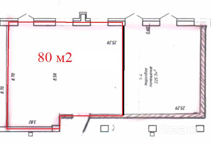 Торговое помещение площадью - 80 м2 располагается на 1-ом этаже в прикассовой зоне магазина «Евроопт», по адресу ул. Асанлиева, 44.