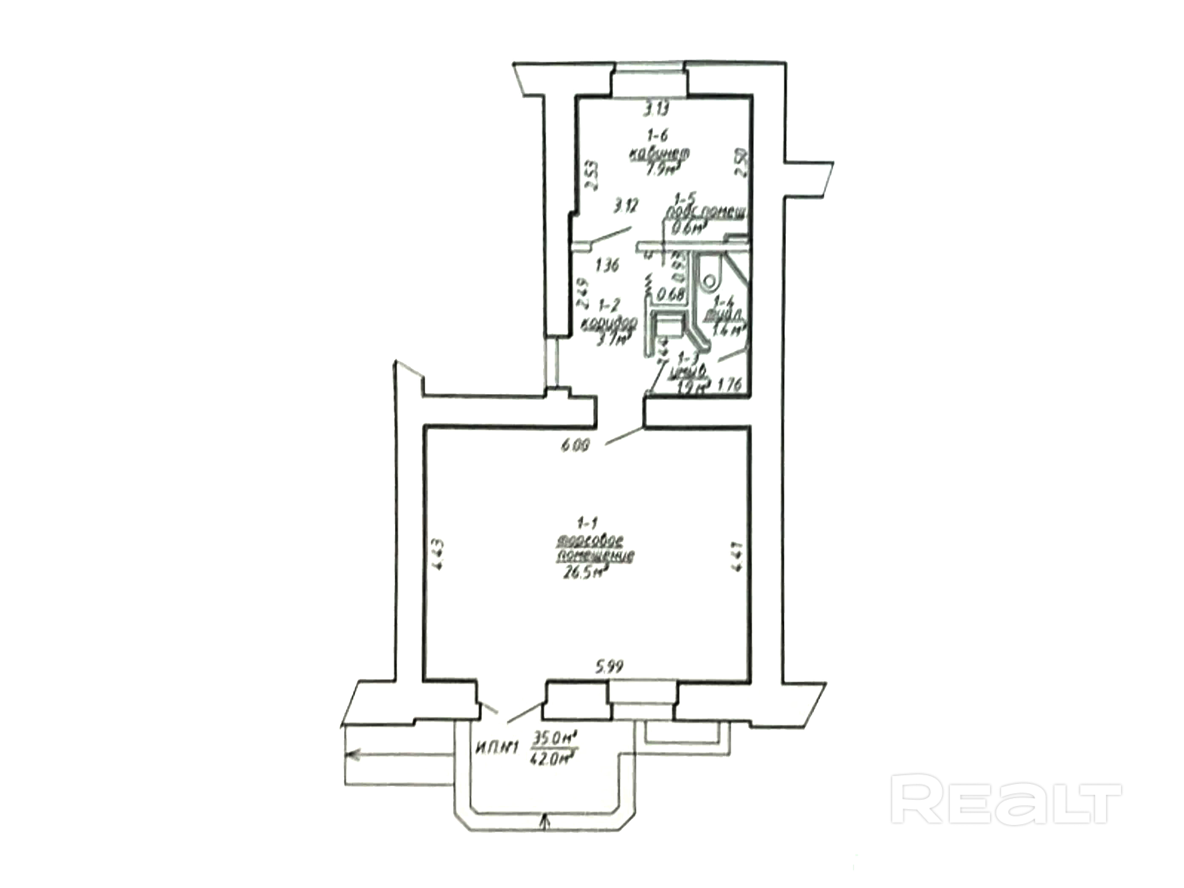 Помещение состоит из двух комнат, коридора, небольшого подсобного помещения и санзула.