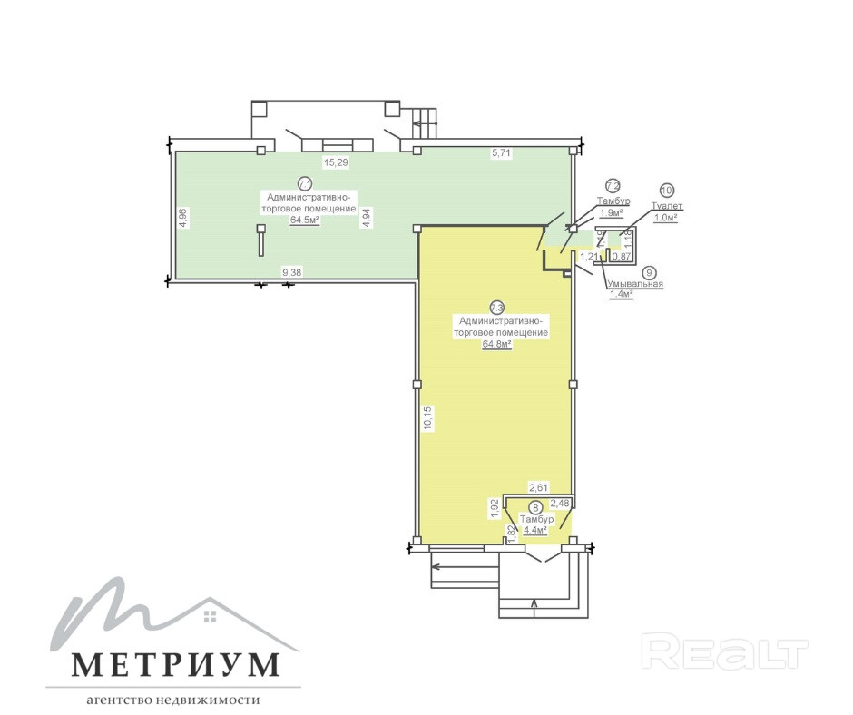 · Гибкость формата: Общая площадь помещения составляет 134,6 кв. м. Есть возможность разделения на два самостоятельных блока (64,8 кв. м и 64,5 кв. м) с организацией отдельных входов.