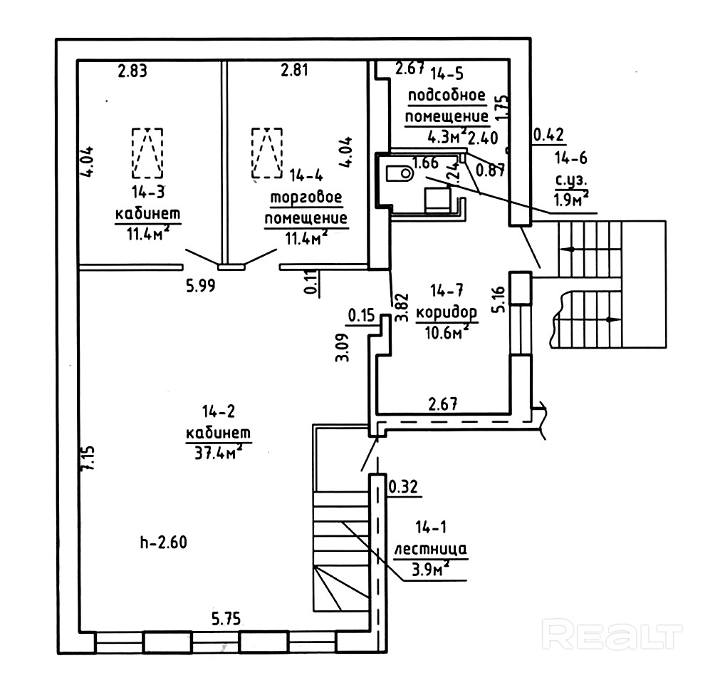 Площадь помещений 80.9м2. Три комнаты 37.4, 11.4, 11.4м2, коридор, подсобное помещение и санузел. Высота потолка 2.6м.