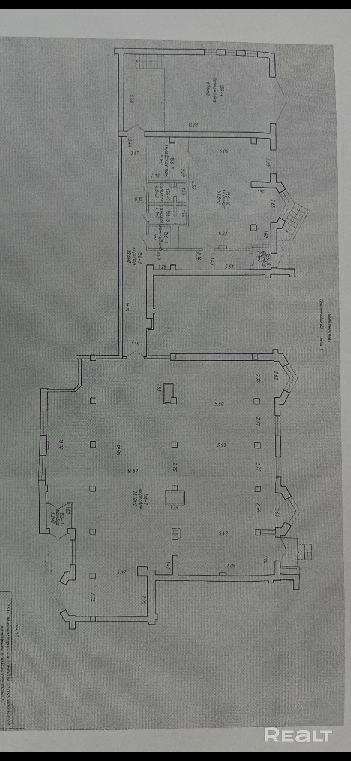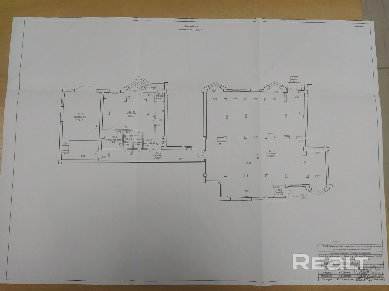Административно-торговое помещение. Общая площадь помещения 438.9 кв.м., из них торговая площадь 261 кв.м., площадь вспомогательных помещений 177.9 кв.м. Два санузла. Три отдельных входа, рампа. Цена указана за квадратный метр без НДС.