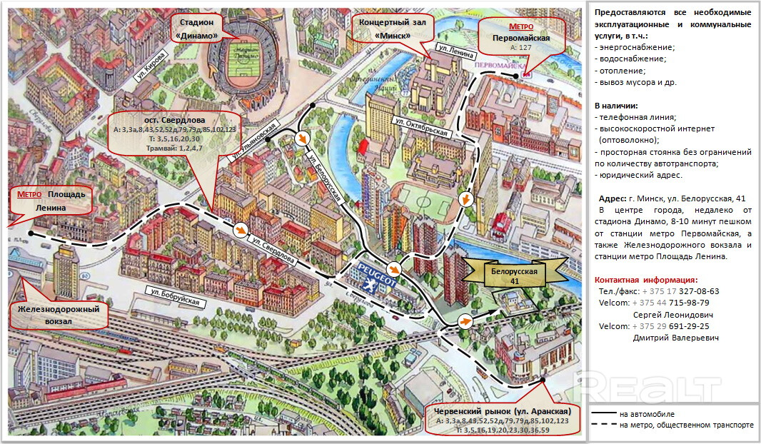 Адрес: г. Минск, ул. Белорусская, 41 (в центре города; недалеко от стадиона Динамо; 8-10 минут пешком от станции метро Первомайская, а также Железнодорожного вокзала и ст. метро Площадь Ленина)