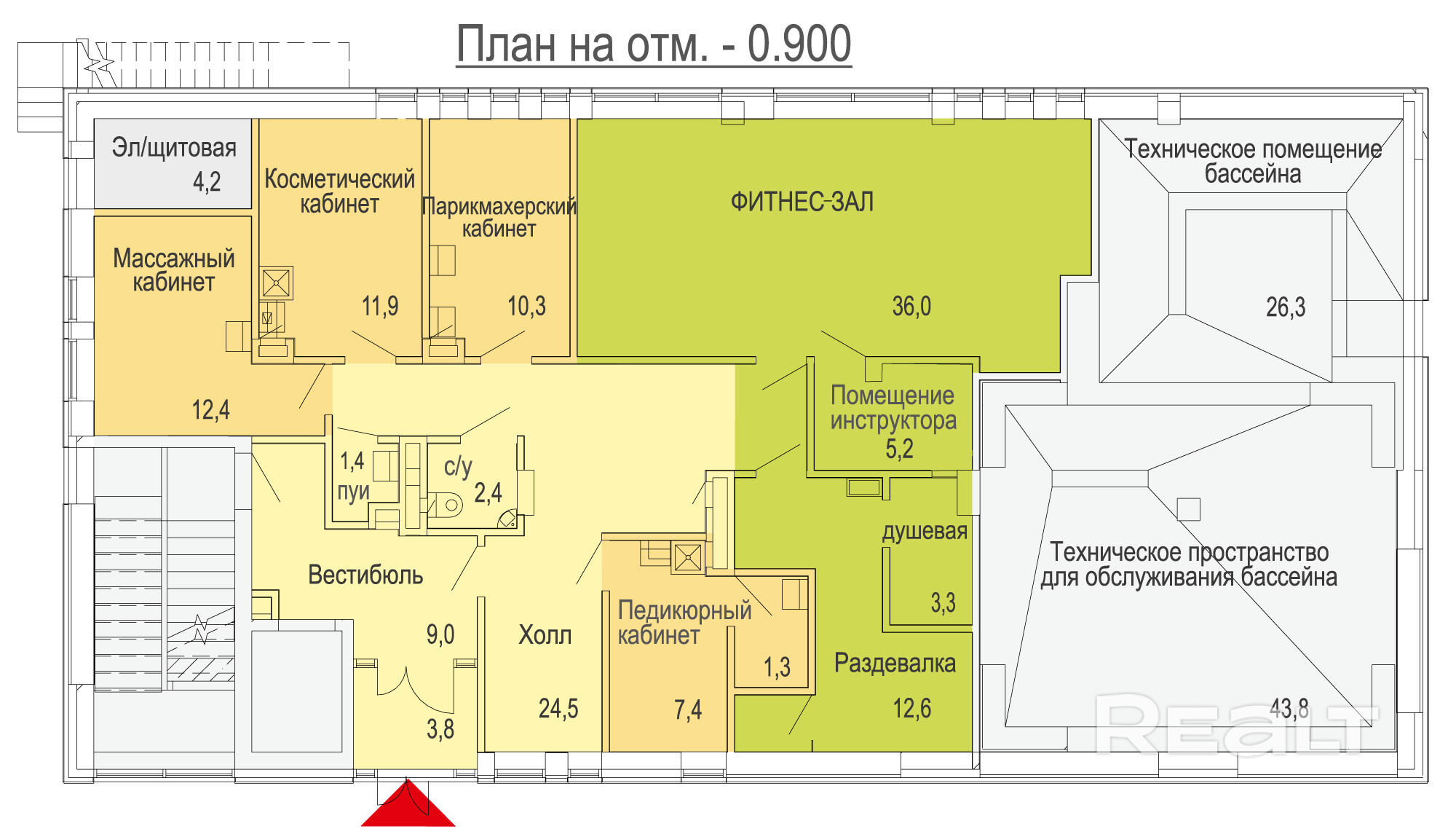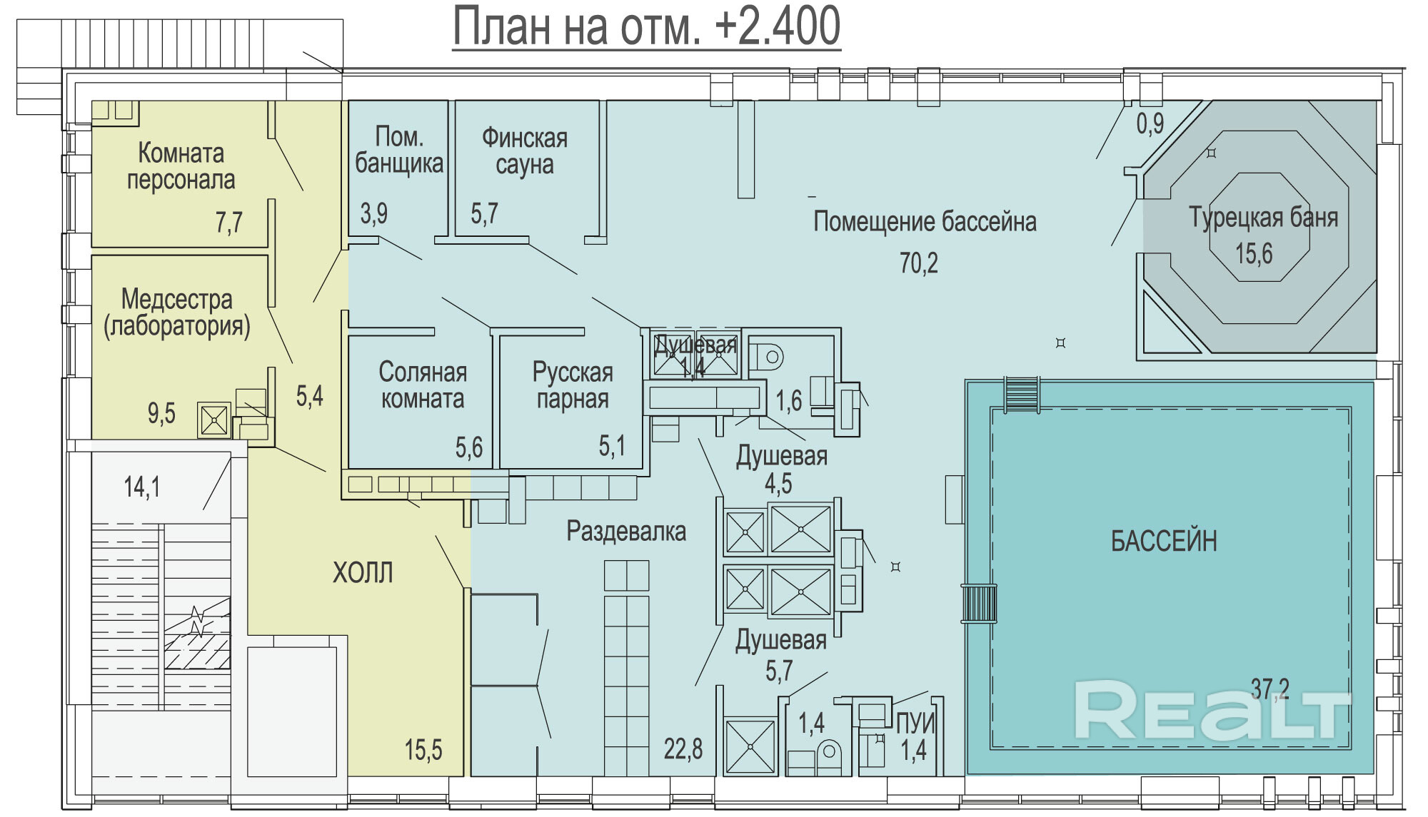 Общая площадь 500м2, из них 291,2м2 - бассейн с группой саун, 130м2 на первом этаже для здоровья и красоты.