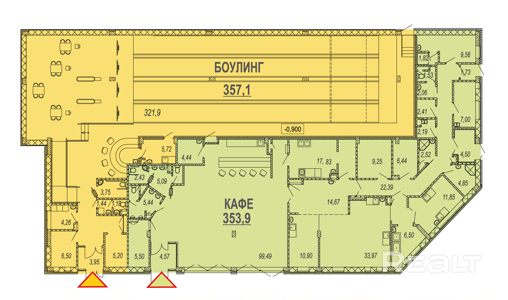 В здании помещение для кафе и отдельное помещение для размещения боулинга. Два синергичных развлекательных формата под одной крышей создают эффект сочетания услуг, увеличивая время пребывания посетителей, что прямо влияет на выручку. Боулинг можно использовать как фитнес-зал, зал для семейных праздников, VR-арену, помещение для квестов, скалодром, dark-kitchen, фото- и танцевальную студию и тп.