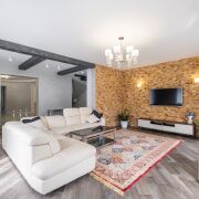 - на стенах нанесена венецианская штукатурка и фактурный натуральный сланец;
