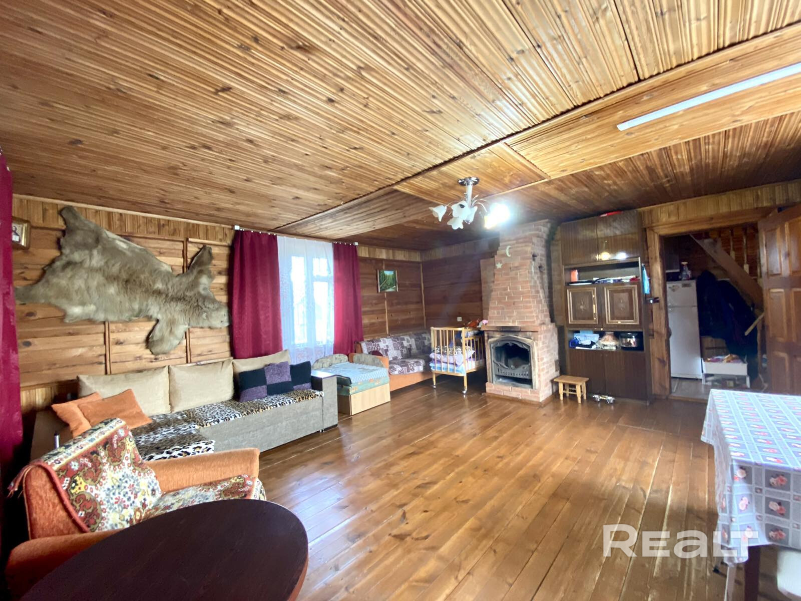 Жилая часть дома выполнена из сруба (1995 года постройки), оборудована всем необходимым и полностью готова к проживанию. На первом этаже располагается кухня с мебельным гарнитуром и плитой, а также просторная жилая комната с камином. На втором – находится еще одна жилая комната со спальными местами и лежанкой.