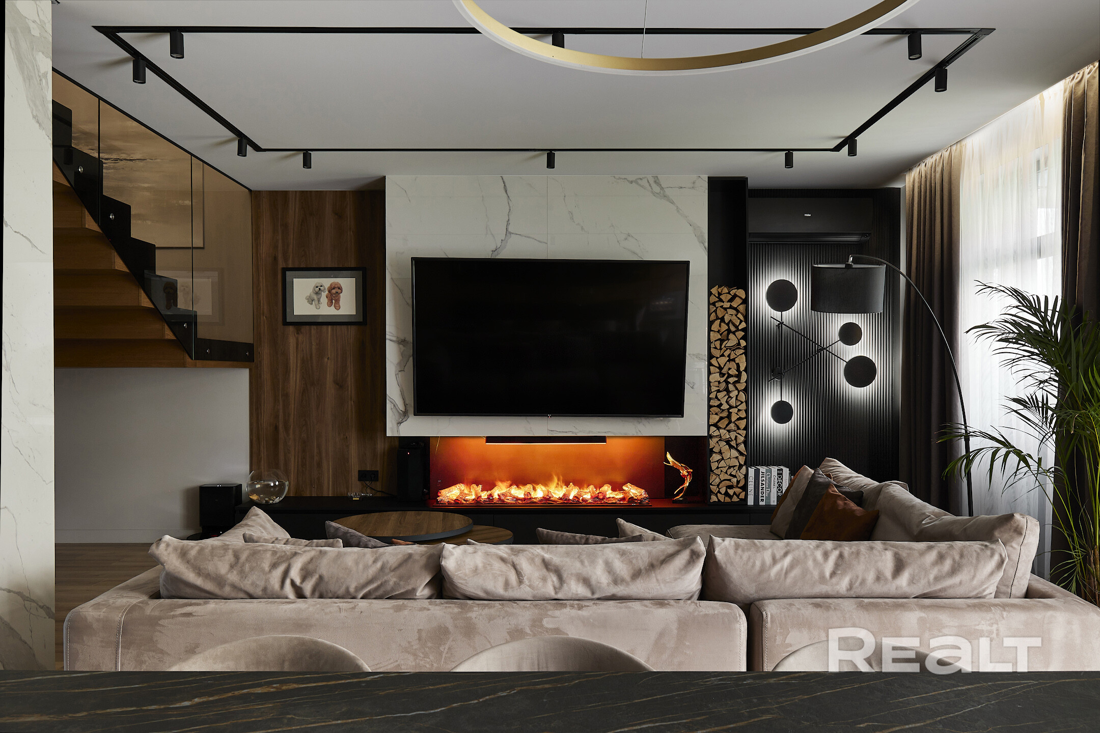 -выполнен дорогой дизайнерский ремонт -гараж с ролетой + 2 парковочных места + гостевые места - терасса 25кв.м Остекленена . газовый гриль, мебель на терассе, - 40 трехметровых туй на участке - первый этаж: цельное помещение - зал с кухней, санузел, гардероб, котельная с постирочной - второй этаж: спальня с большой гардеробной, детская, гостевая, большой санузел с душевой и ванной. 4 кондиционера. Лестница обшита дорогим деревом, вся мебель заказная, 3 телевизора (в зале размер 86 дюймов).