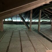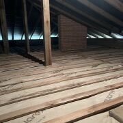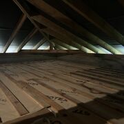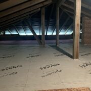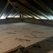 Сделано утепление перекрытия холодного чердака каменной ватой ISOVER OPTIMAL толщиной 300мм., накрыто кровельной мембраной STROTEX, зашито доской 22*100мм , шаг 200мм., доска пропитана антисептиком Сенеж УЛЬТРА.