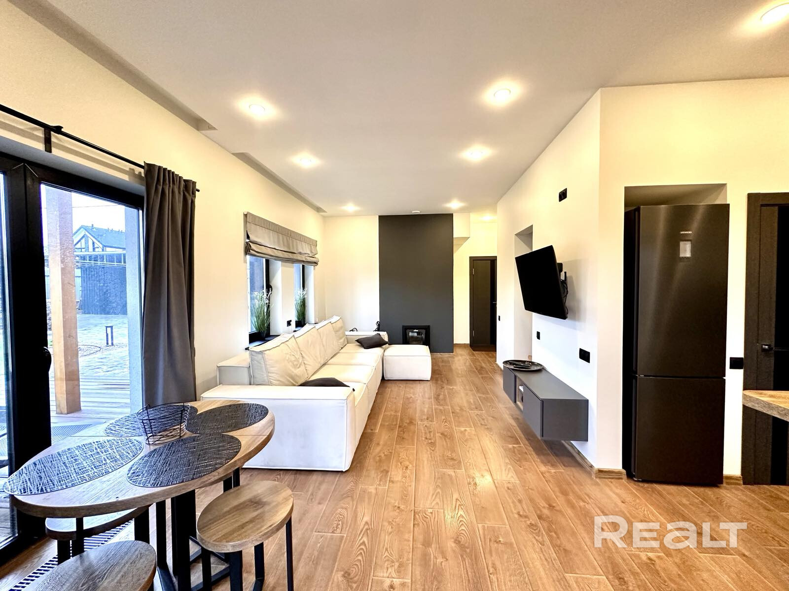 На первом этаже просторная кухня-гостиная с камином, сауна (на дровах) с отдельным выходом на терассу, санузел, душевая, прачечная, зона гардеробной.