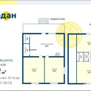 На первом этаже расположена кухня,совмещенная с гостинной - 43.2 м2, а также 2 жилые комнаты - 27 м2 и 26 м2; санузел и котельная.