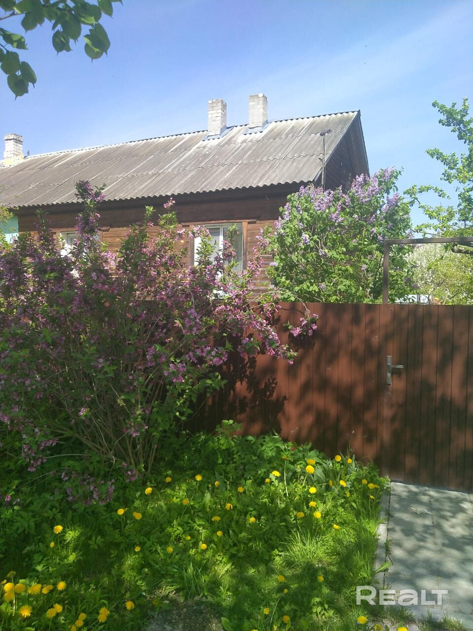 Участок в 5 соток обнесен красивым забором.Есть деревья,кустарники и красивая дорожка.