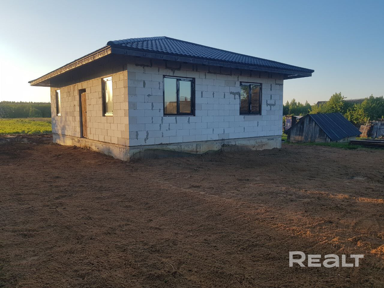 Дом одноэтажный размерами по фундаменту 8,5х10,7 м, фундамент ленточный со щебнем, имеется черновая стяжка, стены и межкомнатные перегородки из газосиликатных блоков размером 625х300х249мм, двухкамерные стеклопакеты с внешней коричневой ламинацией, крыша металочерепица 4-ех скатная. В имеющемся строение выведены три комнаты (15,1 м2, 16,3 м2, 11 м2) и кухня (10,7 м2), прихожая (7+3,3м2), санузел с окном (6 м2), в одной из комнат окно панорамное, в другой комнате распашная дверь из стеклопакета, где можно на участке обустроить террасу, оборудован выход для камина из кирпича, имеется отдельный вход в дом с временной дверью. Высота пололков 3 метра. Предполагалось использование отопления на газу, но можно использовать и электро