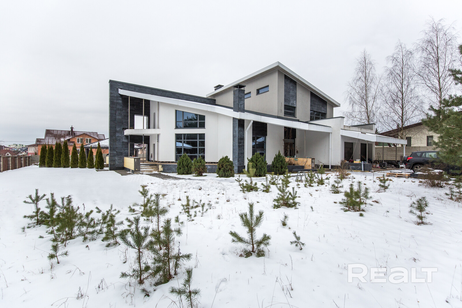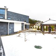 - Дом выполнен в стиле современного минимализма с высококачественными отделочными материалами. Бело-серый фасад, украшенный декоративными элементами из натурального индийского камня, многоуровневая плоская кровля – все это подчеркивает индивидуальность и высокий статус владельца.