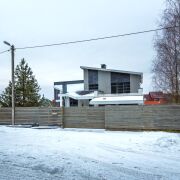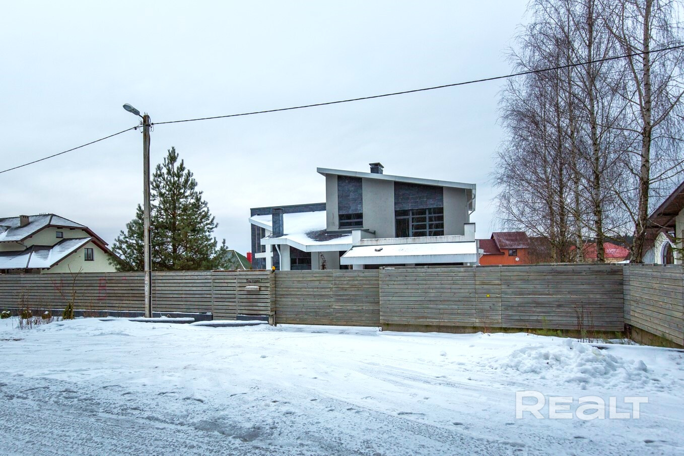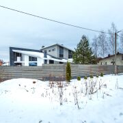 - Стильный, надежный забор, откатные ворота, парковочные места для нескольких автомобилей.