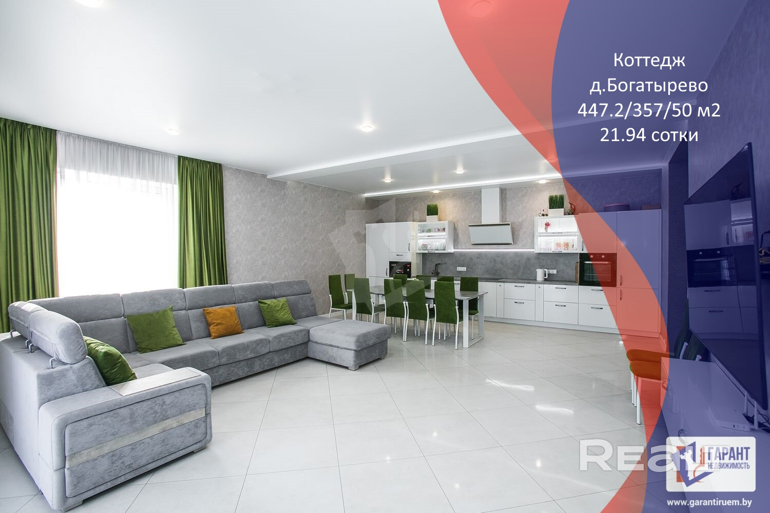 Общая площадь дома — 357 м2. Внутри выполнен дизайнерский ремонт с использованием экологически чистых материалов. Продуманная планировка, высокие потолки с регулируемым освещением и большие французские окна создают атмосферу уюта и простора.