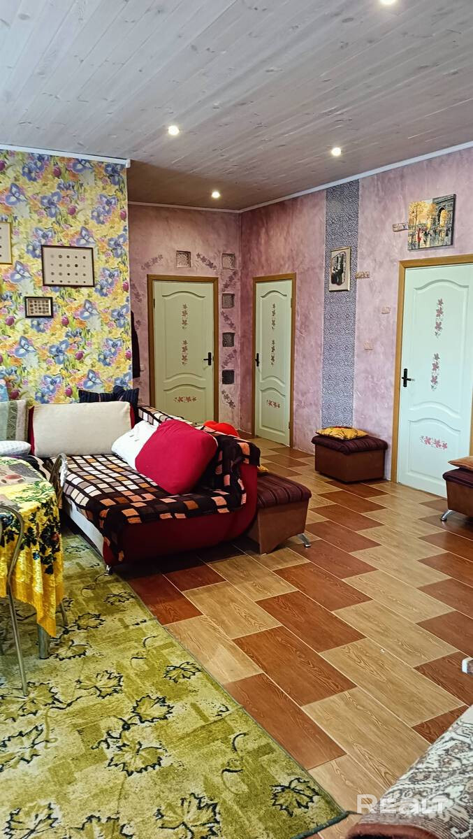 Рядом лес с грибами. Асфальт до самого дома. Электричка на Брест (Столбцы- Барановичи)в 1 км от деревни(15-20мин. не спеша ) станция Клыповщина. В прямой видимости расположен горнолыжный комплекс и санаторий "Веста" , где можно покататься на лыжах и половить рыбу (2 озера).Оборудованный пляж для летнего отдыха и бассейны зимой. В 3 км г. Дзержинск. Деревня жилая. В ней постоянно проживает население ,которое работает в Дзержинске и в Минске. Дом построен по польскому проекту из блоков толщиной 400мм. Оштукатурен с армированием и покрашен акриловыми фасадными составами. Кровля из Ондулина, что обеспечивает тишину при дожде и сохранения тепла. Расположен на участке 0.25га и предназначен для круглогодичного проживания большой семьи. Участок огорожен забором из металлопрофиля и сетки рабица . Общая площадь дома -196.92м2 из них жилая 144.8м2. Первый жилой этаж( высота потолка 3м)-3 спальни 12.5м2-13.8м2-11.1м2 , зал -40м2 , ванна 8.4м2 туалет 2.3м2 тамбур 3.7м2 .пристроенная кухня 10.3м2 и котельная 2.52м2.