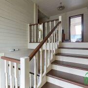 Стены: профилированный сосновый брус, утеплен эковатой (целлюлозная вата). Снаружи покрашен пропиткой Tikkurila.