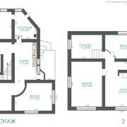 На участке так же расположились гараж с навесом и баня. На первом этаже кухня, 2 жилые комнаты, санузел и гараж. На втором этаже 4 комнаты, санузел и зимний сад, 3 этаж мансардный с большой комнатой и санузлом.