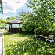 Удачно распланирована и красиво оформлена территория, прилегающая к дому. На огороженном участке 16,15 соток в частной собственности красивый, идеально ухоженный газон, высажены декоративные растения, туи, плодовые деревья (яблони, груша, черешня, вишня, слива), ягодные кустарники, клубника, виноград, есть теплица. Около дома небольшая беседка, а также место под большой бассейн, уложена плитка. Установлено уличное освещение. Забор из металлопрофиля, ворота откатные.